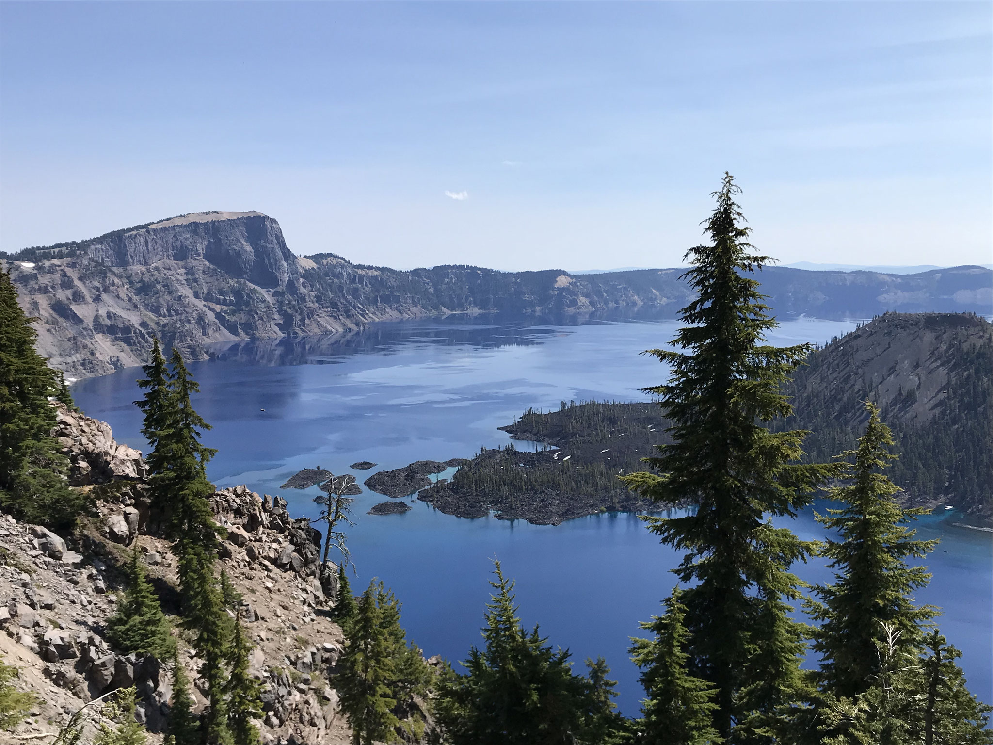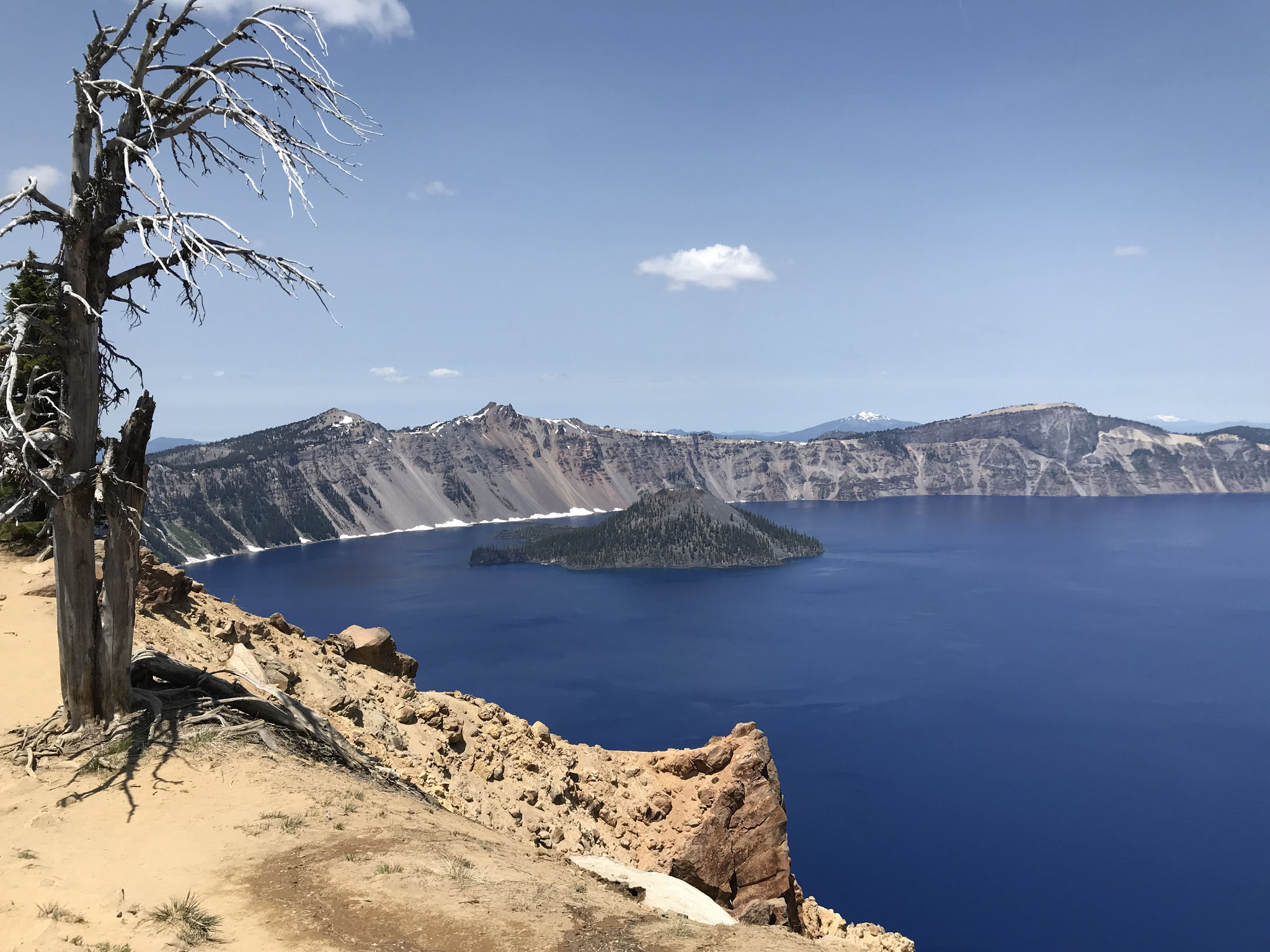 Den Bildern im Internet nach zu schliessen, muss der Crater Lake ein absolutes Highlight einer jeder Reise werden! Wir freuten uns dementsprechend auf diesen Tag und machten uns früh auf um die berühmte Caldera mit dem tiefblauen See zu bewundern. Im Lava Beds Nationalpark hatten wir bereits den Eintritt für den Crater Lake Park(45 USD für beide) bezahlt und kamen deshalb schnell durch die Eintrittskontrolle und waren sehr früh oben am Kraterrand in Rim Village. Wir hatten noch genug Platz und Ruhe um die grandiose Aussicht auf den riesigen und tiefblauen Kratersee zu geniessen. Wir wanderten auf einem abwechslungsreichen Weg am Kraterrand entlang und staunten von verschiedenen Plätzen aus über die atemberaubende Szenerie und die extrem blaue Färbung des Sees. Es begegneten uns einige "echte" Wanderer, die mit Sack und Pack auf dem PCT(Pacific Crest Trail) unterwegs waren, sonst befanden sich so früh nur wenige Unentwegte auf dem Weg. Als wir jedoch auf dem Rückweg zum Parkplatz beim Visitor Center waren, kamen uns immer mehr Gruppen von Touristen und Feriengästen entgegen. Wir sahen viele amerikanische und indische Familien, die das verlängert Wochenende um den Nationalfeiertag für einen Ausflug zum Crater See nutzten. Um die Mittagszeit dann waren die Parkplätze schon ziemlich voll, das Restaurant und der Giftshop im Visitor Center sehr gut besucht. Wir entflohen dieser Menschenmenge ziemlich schnell und wanderten noch zum Aussichtspunkt auf dem Garfield Peak, auf 2454m. Leider schafften wir es nicht ganz, weil noch ziemlich viel Schnee lag und wir nicht zuviel riskieren wollten. Die Aussicht von weiter unten war ebenso toll und der Menschenauflauf hielt sich dort oben in Grenzen und wir hatten unsere Ruhe. Es war das erwartete unvergessliche Erlebnis, das wir in vollen Zügen geniessen konnten, bis ....